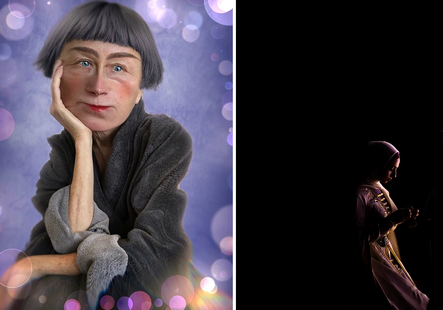 © Cindy Sherman. “In a pensive sort of mood” (11/1/2017), 10 x 12 inches. Right: © Diana Markosian. “Backstage, Chechnya” (2019),10 x 12 inches -