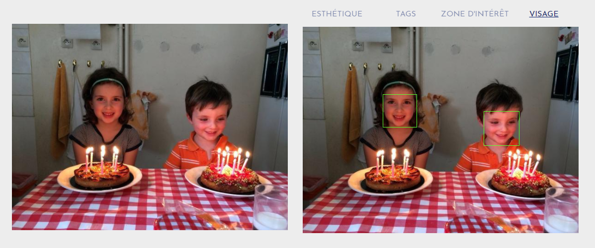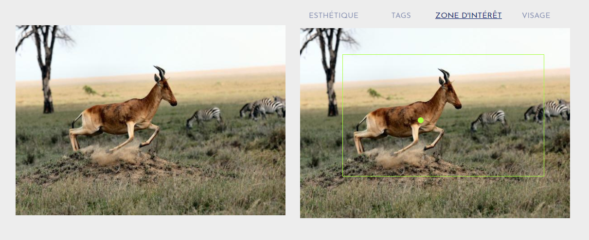 L’intelligence artificielle propriétaire de Regaind est en l’état actuel des choses capable de faire une analyse de différents aspects de la photo. Sur le site de Regaind, on peut ainsi voir une présentation en 4 onglets : esthétique, tags, zone d’intérêt et visage.