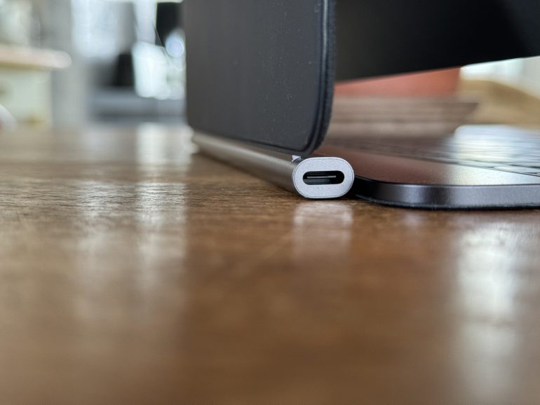 Le Magic Keyboard dispose de son propre connecteur USB-C pour la charge en pass-through. Cela laisse le connecteur Thunderbolt / USB 4 de l’iPad Pro libre pour d’autres accessoires (écran externe, disque externe, etc.).