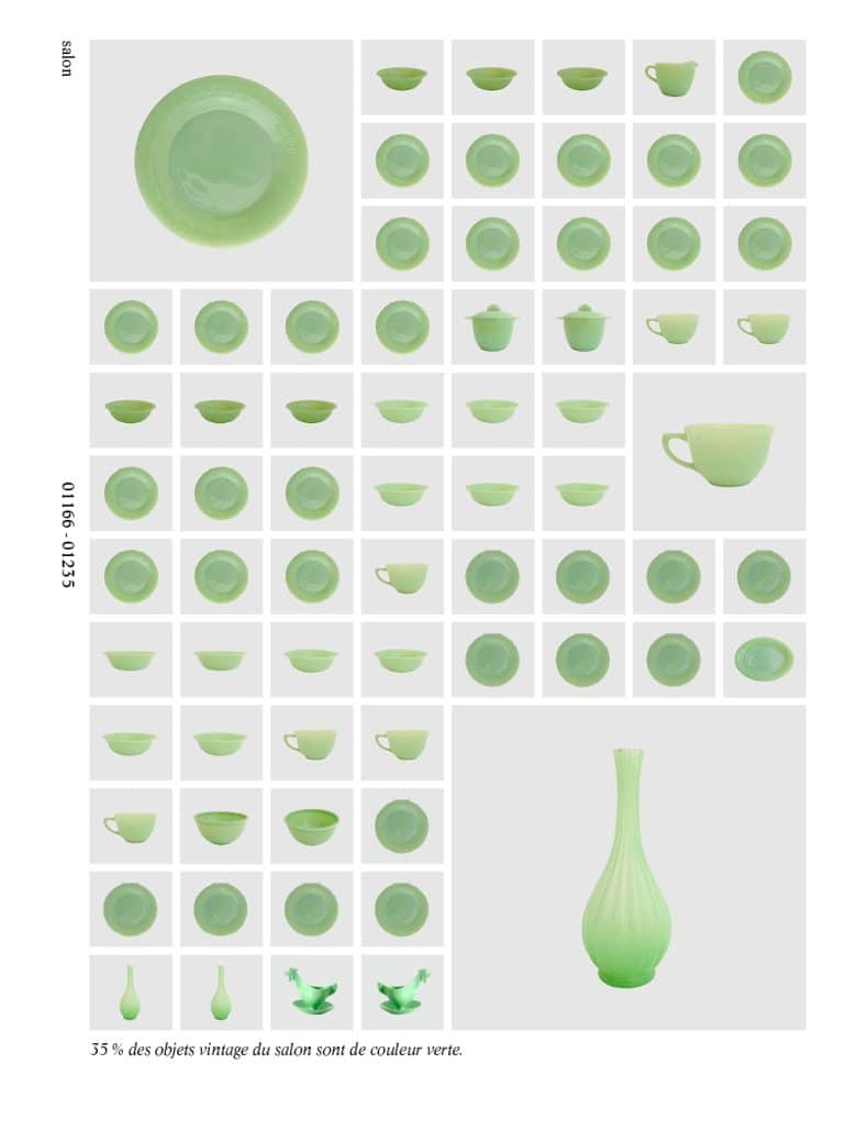 La photographe ne s’est pas limité à photographier ces objets, elle les a aussi analysés : utilisant les performances d’un tableur Excel, elle a établi des statistiques sur cette masse informe, donnant au récit une logique absurde et irrésistible avec de courtes phrases en légende de certaines planches. Quelques constats sont alors dressés : « 90 % des gants se perdent dans les deux semaines qui suivent leur acquisition », « La somme dépensée pour tous les objets de la maison est estimée à 121 046 € », « 37 % des Playmobil de la maison sont chauves » ou « J’ai la faiblesse de croire que je suis la seule personne au monde à savoir que la couleur dominante de sa maison est le bleu ».