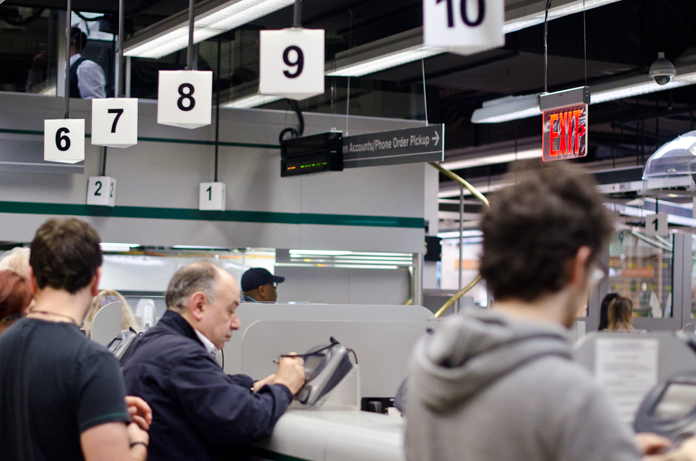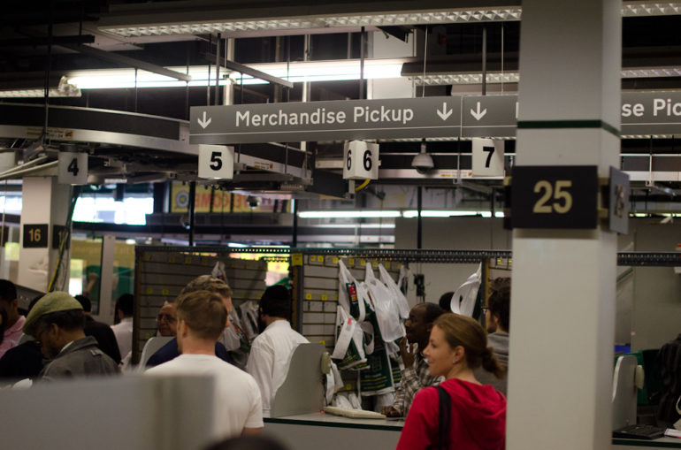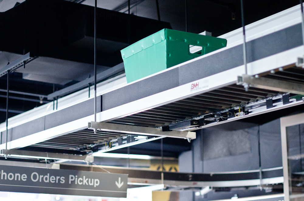 Initialement conçu pour éviter le vol des clients (et des vendeurs !), B&H fait transiter ses milliers d’appareils depuis les stocks en sous-sol jusqu’au comptoir vendeur, puis vers la zone de retrait via des tapis roulants installés PARTOUT dans le magasin, du ras du sol au plafond.