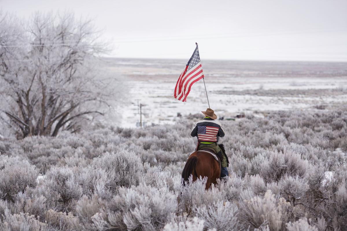 Le militant anti-gouvernement fédéral Duane Ehmer sur son cheval Hellboy dans le parc naturel national Malheur, lors de l’occupation et de la confrontation dans l’Oregon, Etats-Unis – © Rob Keff/AFP/Getty Images.