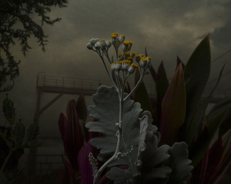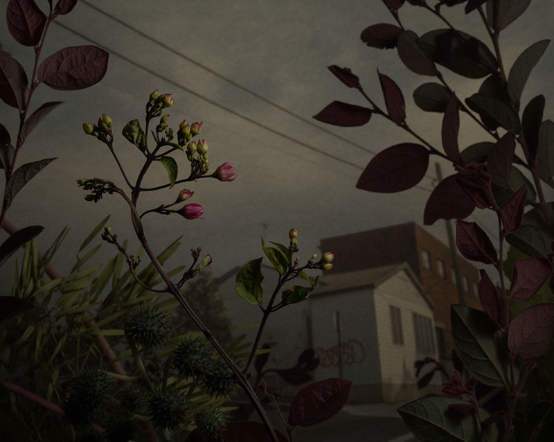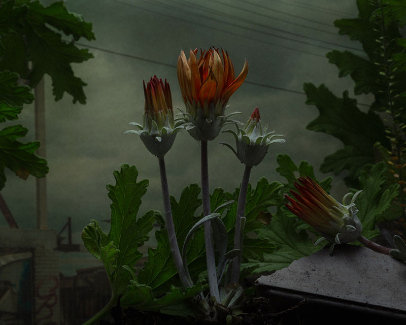 Dans la journée, Daniel Shipp chasse les plantes qui seront le sujet de ses prochains clichés. Une fois de retour à son studio, il arrange celles-ci devant des fonds urbains en portant un soin tout particulier à la composition et à la lumière.
