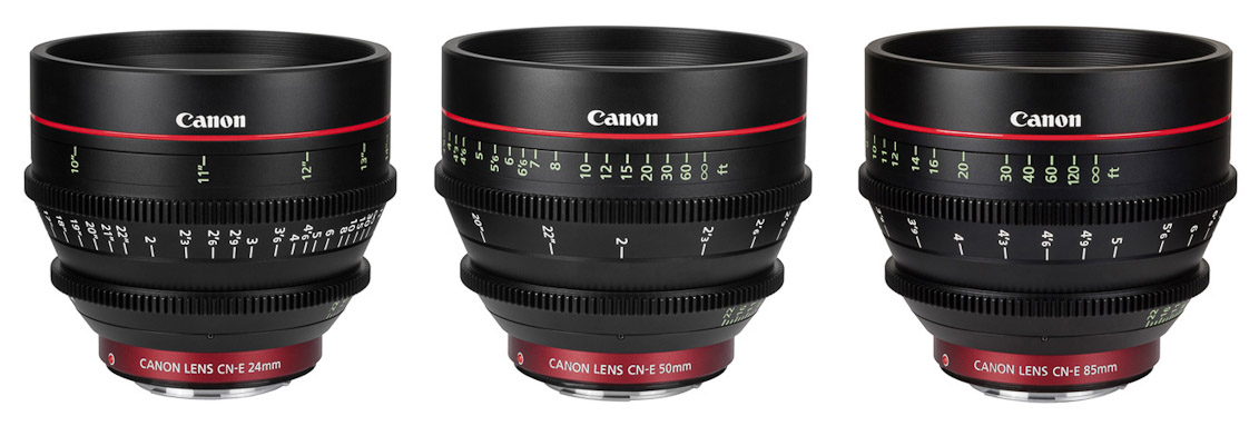 Canon sort aussi 3 focales fixes en monture EF : les CN-E24mm T1.5 L F / CN-E50mm T1.3 L F / CN-E85mm T1.3 L F *, qui, très bon point, sont utilisable à la fois sur l’EOS C300 et sur les autres DSLR Canon. Il s’agit surement de versions très proches des séries L pour les EOS avec comme prévu, une bague de mise au point disposant d’une plus grande course pour les focus fluides.