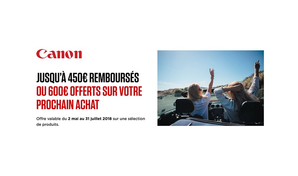 Pour tout achat d’un produit éligible entre le 2 mai et le 31 juillet 2018, Canon propose une offre de remboursement (ODR) jusqu’à 450 €, ou jusqu’à 600 € dans le cas d’un second achat.