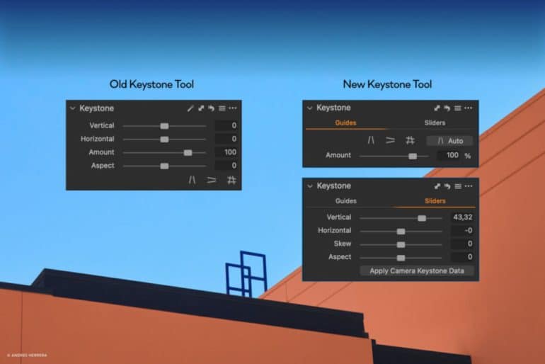Nommé « Keystone », l’outil de correction de la persective de Capture One a vu son design quelque peu chamboulé. En effet, le panneau qui présente ses différentes options est désormais divisé en deux onglets. Le premier permet des modifications par le bais de traditionnels curseurs auxquels a été ajoutée la possibilité d’influer sur la déformation de l’image (Skew). Le deuxième onglet autorise la correction de la perspective par le biais de points de contrôle et se dote d’une fonctionnalité Auto.