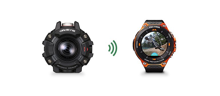 La Casio GZE-1 est compatible avec la montre WSD-F20 / F10 de la marque. Une montre conçue elle aussi pour l’action, elle permettra de commander la caméra à distance, ainsi que de visionner ses photos et vidéos.