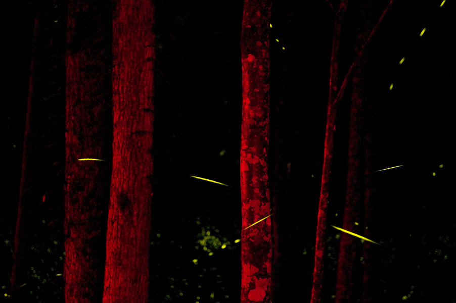 Fascinée par les ballets des lucioles qu’elle y découvre, elle parvient à les « capturer » en réglant trois appareils photos à la fois en pause longue.  Drôle d’expérience et défi technique relevé haut-la-main:  les compositions qui apparaissent sont aussi superbes que mystérieuses. La Nature – aux couleurs presque de science-fiction- dessine une ambiance inquiétante, alors que les nuées de lucioles strient l’espace,  et semblent arrêter le temps.