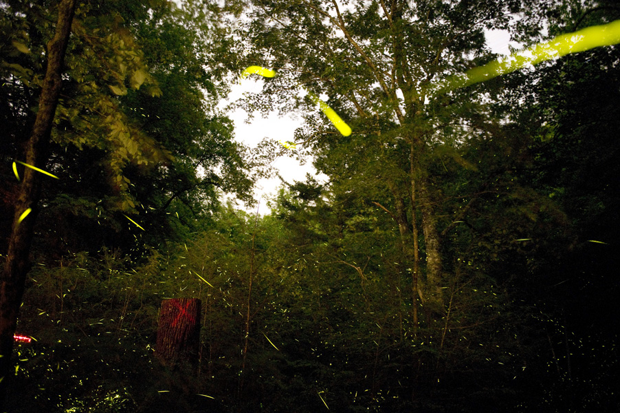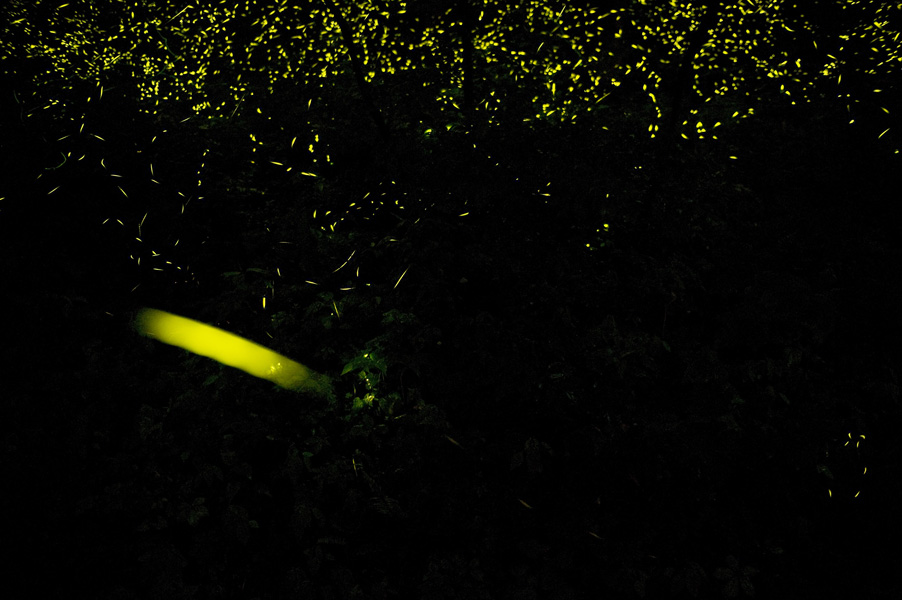 En fait il n’y a pas tellement plus d’explications: les lucioles clignotent de façon aléatoire et la photographe n’a pas voulu choisir d’elle-même à quel moment prendre la photo. Elle a donc laissé trois appareils différents (je ne peux pas dire lesquels…) sur pied et en pause longue. D’où ces pointillés et la force de la lumière dégagée par les p’tites bêtes…