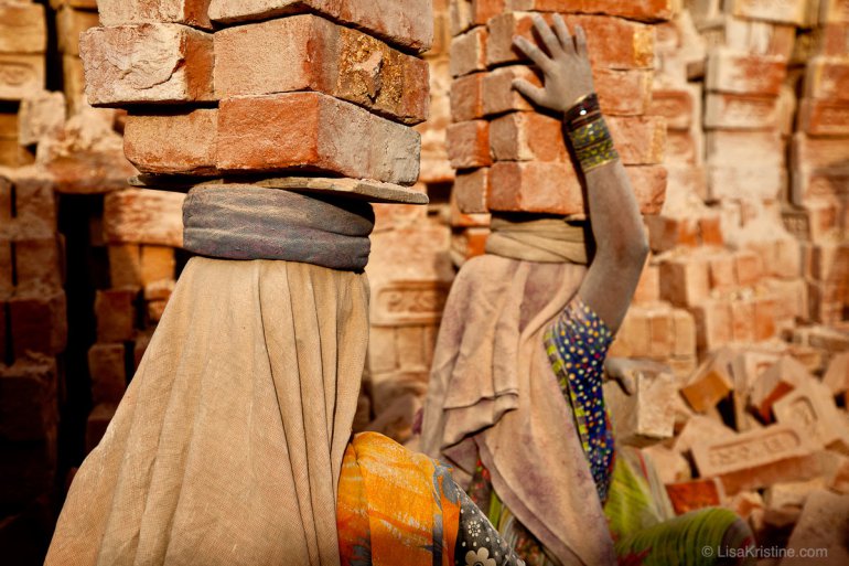 Les hommes, les femmes et les enfants sont recouverts de poussière alors qu’ils continuent mécaniquement d’empiler des briques sur leurs têtes. Ici dans une fabrique de brique en Inde.