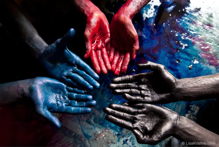 « C’est une photo de famille » a déclaré Lisa Kristine. Celle-ci a été prise dans une usine de textile, en Inde. « Les mains teintées de noir sont celles du père, en bleu et en rouge, ce sont celles de ses fils.