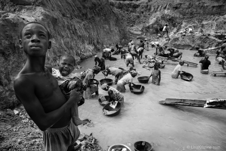 Ici, les esclaves de l’or pataugent dans de l’eau empoisonnée par le mercure afin de se livrer à l’extraction de l’or. Les enfants sont toujours présents, souvent attachés sur le dos des femmes qui travaillent dans ces eaux contaminés.