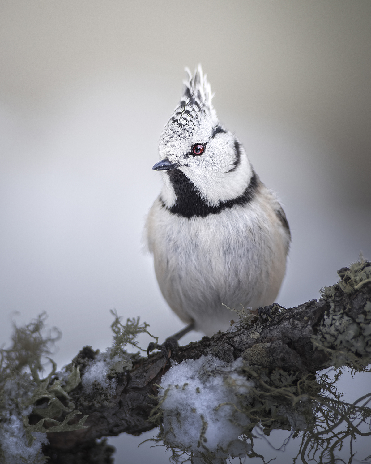 « J’avais déjà photographié de superbes mésanges à crête près de chez moi, mais cette fois, je voulais en photographier un sur un fond blanc flou pour faire ressortir l’œil rouge de l’oiseau » explique le photographe.