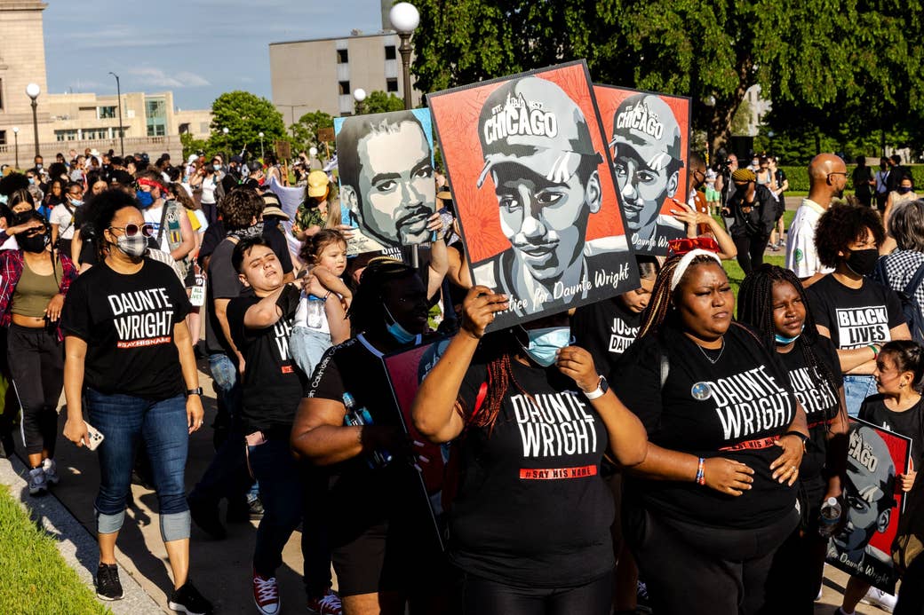 Des personnes tiennent des photos de Daunte Wright, un jeune Noir de 20 ans tué par un policier dans la banlieue de Minneapolis © Kerem Lucel / AFP via Getty Images