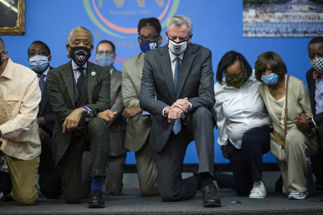 Le révérend Al Sharpton (à gauche), le maire de New York Bill De Blasio et d'autres dirigeants s'agenouillent pendant 9 minutes et 29 secondes à la mémoire de George Floyd pour demander l'adoption du George Floyd Justice in Policing Act of 2021, à New York, le 25 mai 2021. © Kena Betancur / AFP via Getty Images -