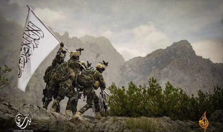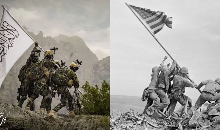 Le retrait des troupes américaines d’Afghanistan a été une occasion en or pour les milices talibanes de se lancer dans une propagande visuelle hautement symbolique : l’un des clichés qui a le plus tourné sur le web a été celui des talibans posant ironiquement de la même façon que les marines américains lors de leur victoire à Iwo Jima en 1945.