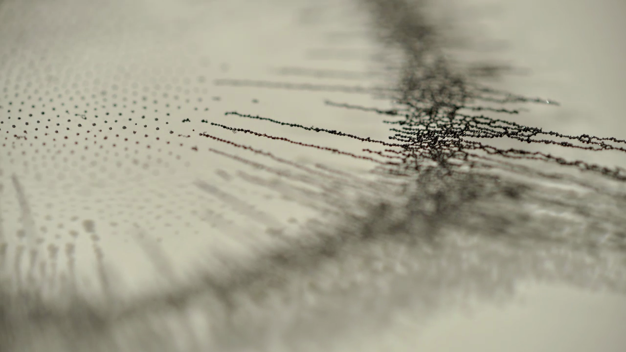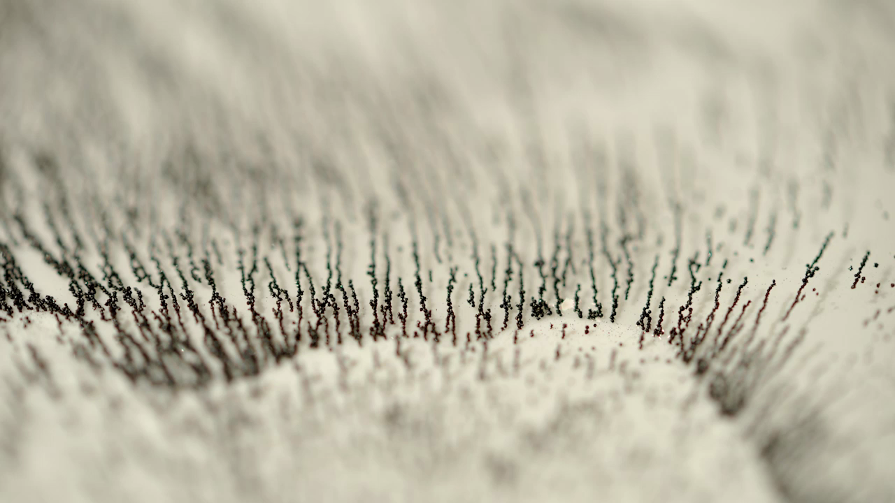 Compressed 01 s’intéresse à des particules de toner issues d’une imprimante, posées à la surface de l’eau, puis déplacées en présence d’un aimant (elles sont ferreuses). Le résultat est étonnant de géométrie et de chorégraphie.