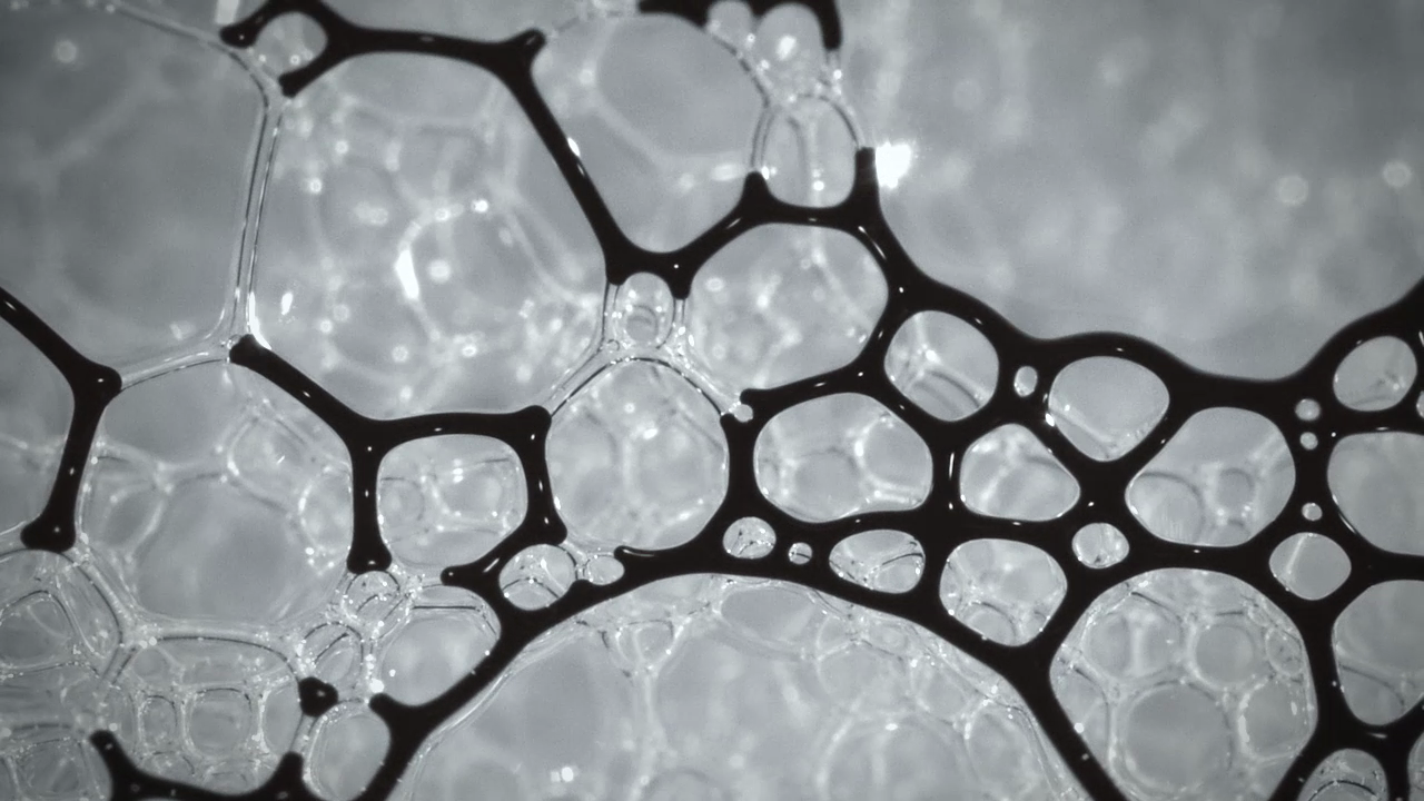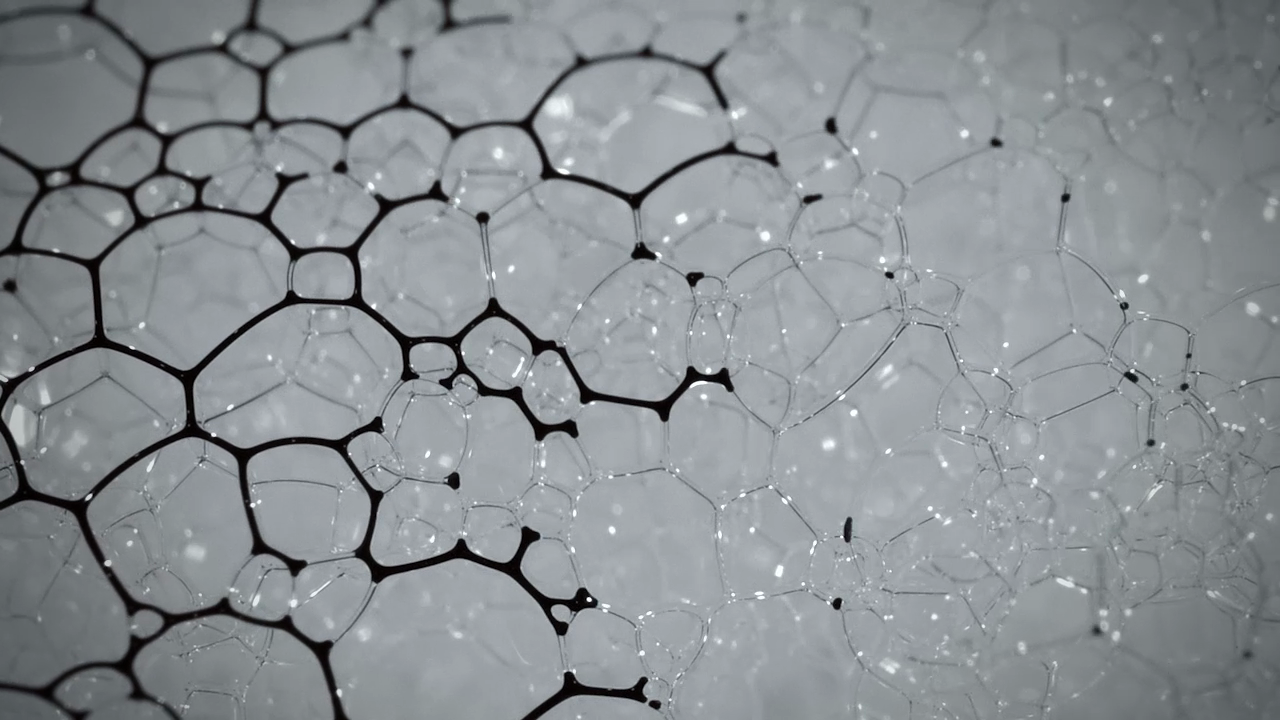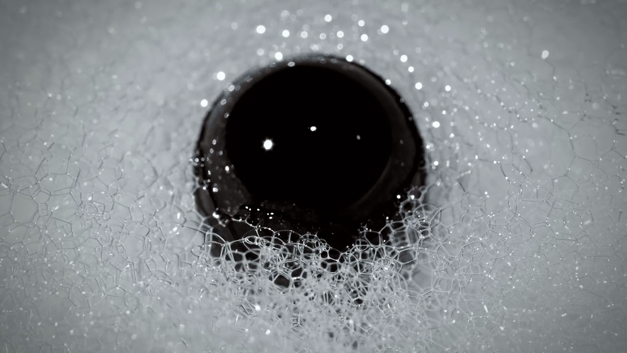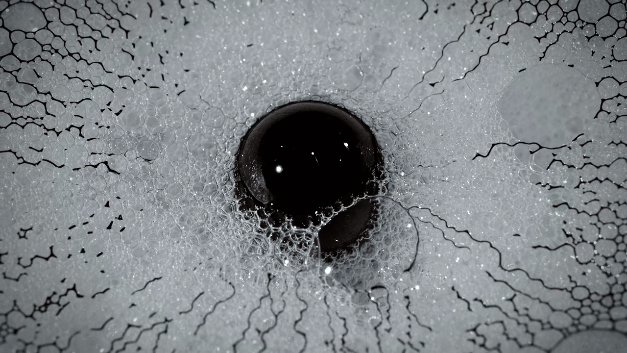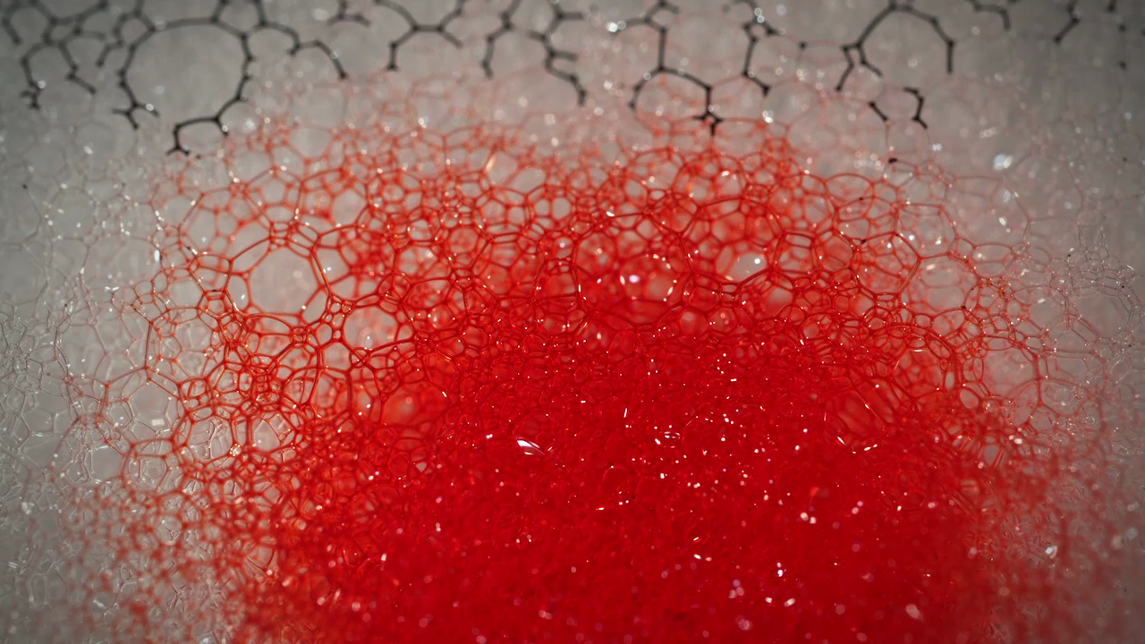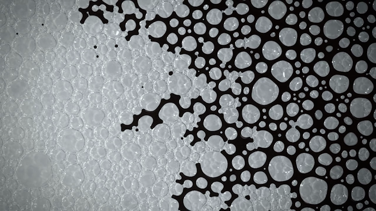 Compressed 02 est encore plus fascinante : Sur une basse de mousse de savon, Pimmel déverse des ferrofluides et du colorant alimentaire pour observer leur trajectoires entre les bulles, encore sous l’action d’un aimant.