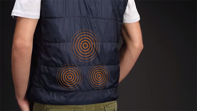 Lorsque le gilet est équipé du système THERM-IC, il permettra de chauffer des zones stratégiques comme les poches à l’avant, et plusieurs points dans le dos. L’idée est de générer une chaleur qui se diffuse au mieux à l’ensemble du corps.