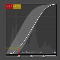 La courbe se lit « de bas en haut et de droite à gauche ». Prenez une valeur sur l’axe horizontal (ici, 25 % en rouge). Remontez jusqu’à croiser la courbe puis reportez vous sur l’axe de vertical pour connaître la valeur modifiée (ici 13 %, en jaune). On retrouve ces valeurs dans les coordonnées en haut à gauche.