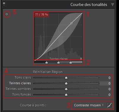 1. La courbe en elle-même (avec les coordonnées du pointeur en haut à gauche). L’axe horizontal correspond à la luminosité de base (des tons foncés à gauche aux tons clairs à droite) et l’axe vertical à la luminosité modifiée (des tons foncés en bas aux tons clairs en haut)