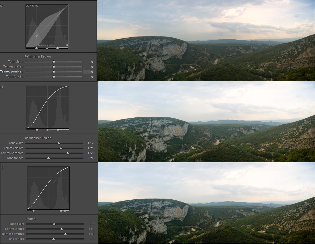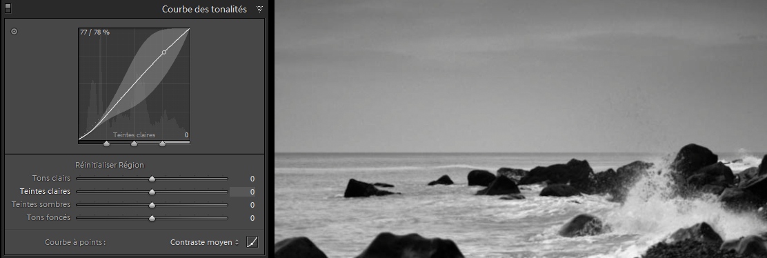 On a vu la semaine dernière comment lire l’histogramme et comment ajuster les réglages pour avoir une photo bien exposée : l’exposition, la lumière d’appoint, les noirs, la récupération, la luminosité et le contraste. L’outil courbe des tonalités est un outil complémentaire de ces réglages. Cet outil va nous permettre de peaufiner les réglages dans des zones de luminosité particulières.