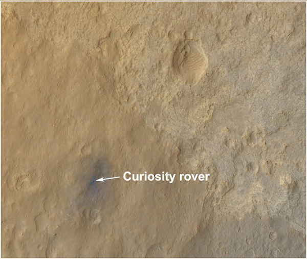 La photo, en plus d’être superbe, montre un Curiosity au milieu d’un immense désert, patrouillant encore dans une zone noirci par les réacteurs du module qui l’a déposé à la surface.