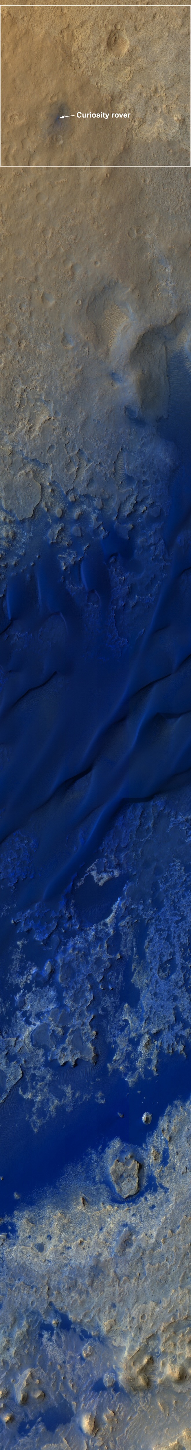 Il se dirige vers le Mount Sharp au Sud – et découvrira de nouvelles topologies. Ne vous emballez cependant pas trop sur les grandes zones bleues : point d’eau à proprement parler, mais la capture infrarouge fait ressortir certaines roches grises pour notre oeil de cette manière.