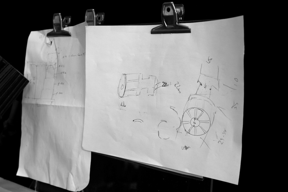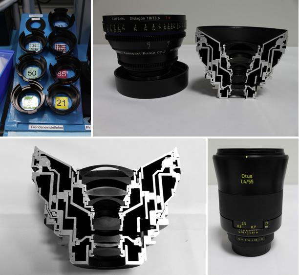 On quitte les ateliers et, surprise, Zeiss nous a mis de côté quelques objectifs. Dont un coupé dans sa hauteur. Un beau plan de coupe qui révèle les 8 lentilles concaves et convexes qui constitue l’objectif cinéma. Une vraie mécanique digne d’un dessin d’archi un peu fou ! Et le petit dernier des objectif photo, le déjà fameux Otus 55mm f/1.4 : Un beau bébé de 970 grammes au design étudié, noir mat, destiné à limiter au maximum la distorsion, et les aberrations chromatiques quelque soit l’ouverture.