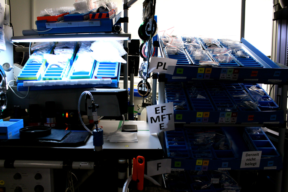 Puis on soupèse une lentille seule, opaque sur les bords qui entrera dans la composition d’un objectif ciné avant que celle-ci ne retrouve sa place dans le « Zeiss Supermarket », la salle où se trouve tous les petits composants qui entrent dans l’assemblage des objectifs. Un vrai magasin de jouet avec couleurs et étiquettes. D’autant plus que ces salariées ultra-qualifiées posent leurs outils sur des « legos ». Oui des legos. Apparemment le meilleur présentoir pour mini-outils !