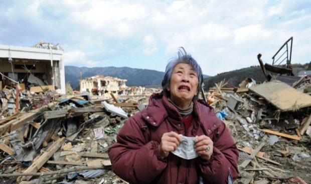 Une femme pleure au milieu des ruines de Rikuzentakata,dévastée par le tsunami au Japon en mars 2011 (AFP / Nicholas Kamm)