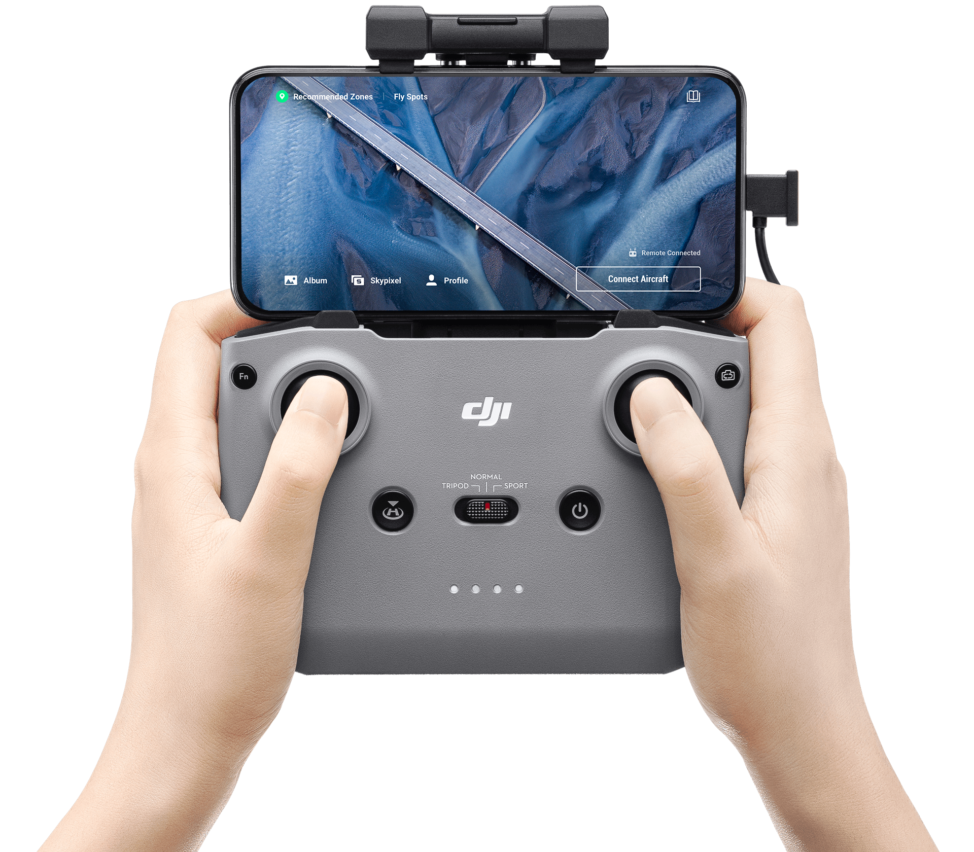 Il est livré avec une radiocommande qui permet d’y fixer un smartphone. Elle n’est pas repliable comme celle de son prédécesseur. Robustesse et ergonomie ont été ici privilégié au détriment de la compacité. La communication s’appuie sur un mode à double fréquence 2,4 et 5,8 GHz, passant de l’une à l’autre automatiquement pour avoir la meilleure liaison possible.