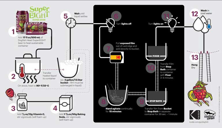 Le point de départ de cette idée folle vient du PDG de Dogfish, Sam Calagione. Il a découvert lors d’un posdcast Kodak (the Kodakery) qu’avec le bon pH, une bière était à même de servir de bain révélateur pour un film Super 8. Les niveaux élevés d’acidité et de vitamine C de certaines bières permettent en effet de servir d’agents de transformation pour les pellicules.
