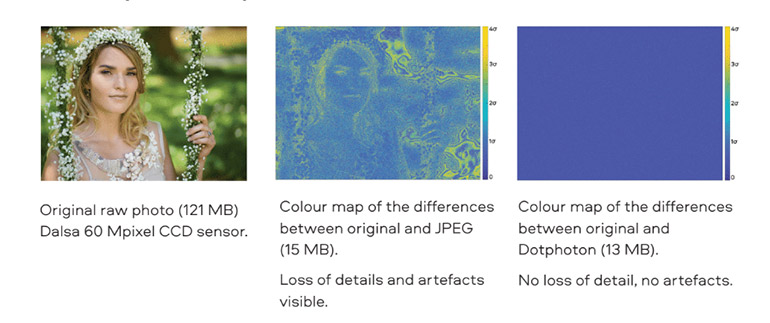 Le logiciel Dotphoton RAW compresse vos fichiers RAW sans perte de qualité grâce à un algorithme qui se charge de supprimer les informations inutiles du fichier. La résolution des images n’est pas modifiée, et le résultat, même en zoom maximal, est identique au fichier original.