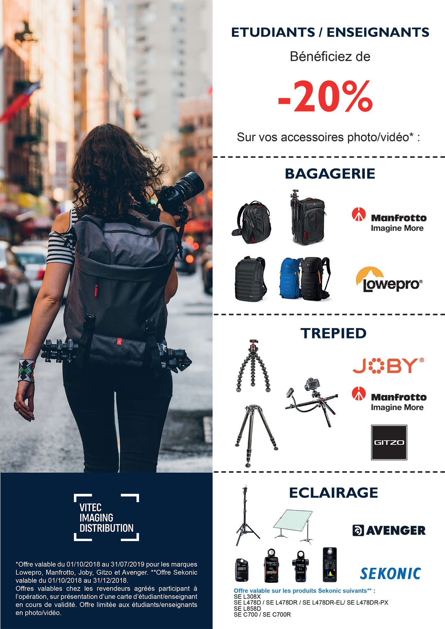 Depuis le 1er octobre 2018 et jusqu’au 31 juin 2019, sur présentation d’un justificatif (carte d’étudiant / enseignant), 20% de remise seront appliqués immédiatement en caisse chez les revendeurs participants à l’opération (spécialistes photo et vidéo, hors revendeurs internet). Pour la bagagerie, toutes les références des marques Manfrotto et Lowepro sont concernées par cette offre. Pour les supports, ce sont les catalogues des marques Joby, Manfrotto et Gitzo qui sont ouverts. Enfin pour la lumière, les accessoires Avenger et les posemètres Sekonic bénéficient eux aussi de la promotion.