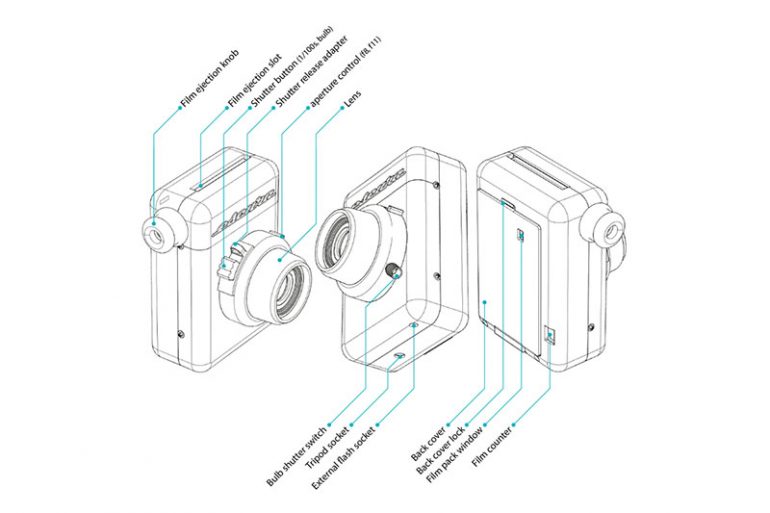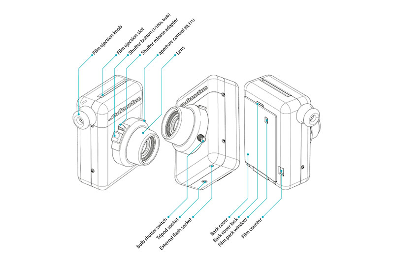 Inspiré du design des années 60, le boîtier dispose de dimensions de 128 x 90 x 83 cm pour un poids de 350 g. Il intègre un objectif 60 mm (équivalent 24×36) autorisant une distance de mise au point minimum de 80 cm, et le choix entre deux ouvertures de diaphragme : f/8 et f/11. Paramétré sur 1/100 s, le temps de pose autorisé par l’appareil peut uniquement être changé pour pratiquer la pose longue à l’aide d’un mode Bulb. Un autre mode de prise de vue permet en sus de réaliser des doubles expositions.