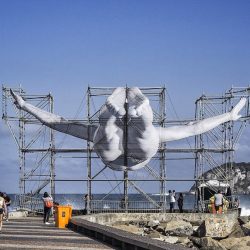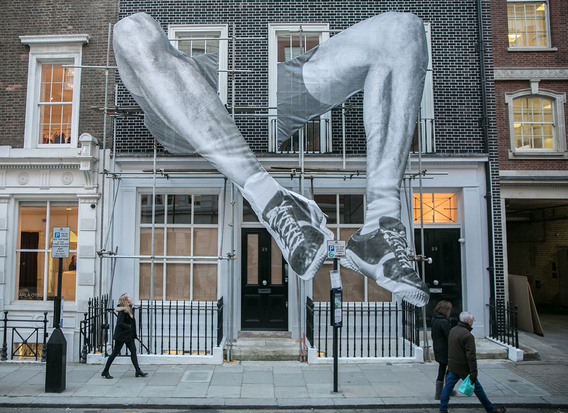 Avec les deux jambes géantes qui s’étalent sur le mur à travers deux fenêtres, la façade du nouvel espace de la galerie Lazinc, dans le quartier de Mayfair à Londres, ne passe pas inaperçue. Il s’agit d’une œuvre de JR, le célèbre artiste français qui y expose une série d’études à propos de son projet Giants qui l’a amené au Brésil à l’occasion des Jeux Olympiques Rio 2016. Dans le cadre d’une résidence d’artistes, JR avait réalisé trois installations dans la ville, où des échafaudages soutenaient de spectaculaires photographies d’athlètes.