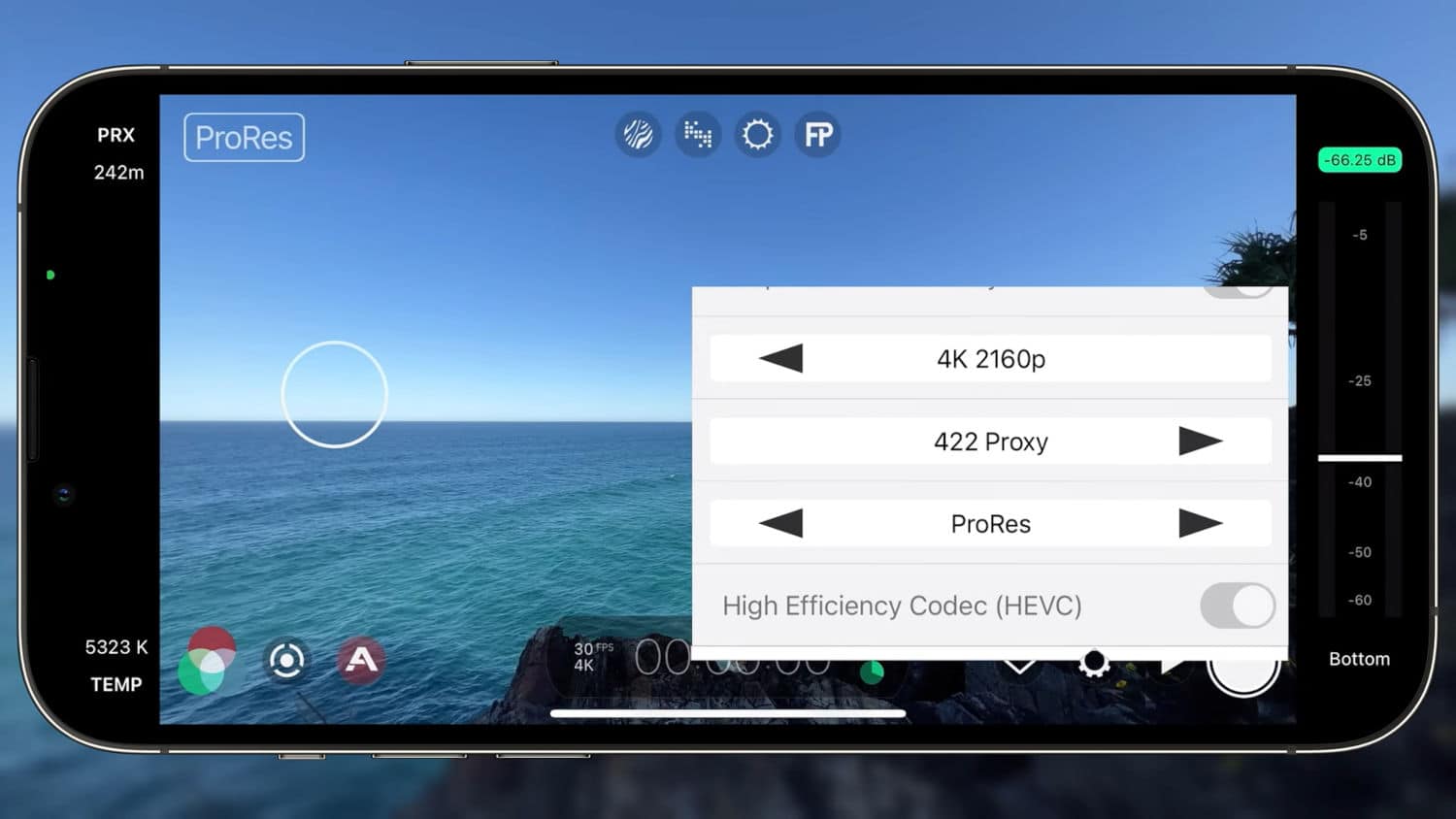 Avec la dernière mise à jour de l’application FiLMiC Pro, les limitations semblent moindres. En effet, si seuls les iPhone 13 Pro et 13 Pro Max sont concernés par la possibilité d’enregistrer des vidéos en ProRes, aucune restriction liée à la capacité de stockage n’est mentionnée. De plus, l’enregistrement en 4K est bien limité à 30 i/s mais la cadence d’image maximale en 1 080p monte à 60 i/s. Notons enfin que sur les six codecs ProRes existants, quatre sont proposés par FiLMiC Pro :