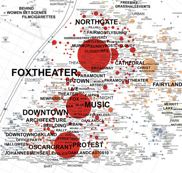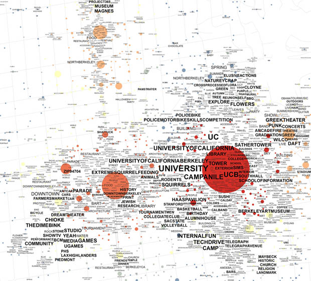 Le but étant, à l’aide de ces centaines de milliers de photos partagées par les utilisateurs de Flickr, de déterminer l’influence des photographes, leurs points de vues favoris, l’inspiration principale dans une zone donnée. Des cercles rouges pour les zones populaires (bleus dans le cas contraire) auxquels viennent se mêler les tags visibles directement sur la carte, plus ou moins grand selon la popularité du sujet choisi.