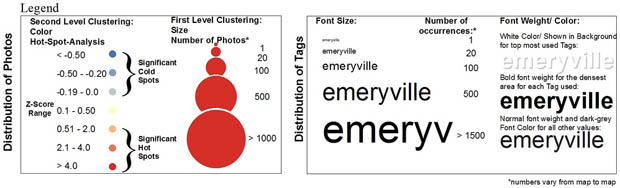 En se servant de la géolocalisation et des tags qui accompagnent les photos entre 2006 et 2011, Alexander Dunkel développe un système de carte interactive pour répondre à cette question. Des cercles de couleurs et de tailles différentes permettent de déterminer avec précision le nombre de photos prises ainsi que le sujet de la photo. Ce système à mi-chemin entre le tag et le cloud se base sur les données fournis par les usagers, dans la même veine que Sightsmap sorti l’an dernier.