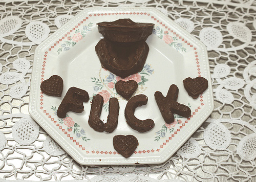 J’ai créé volontairement une atmosphère romantique mais en y insérant le mot « fuck » qui a une signification forte. La machoire en chocolat vient appuyer ce mot, le faire résonner comme un cri et aussi un peu comme un rire.