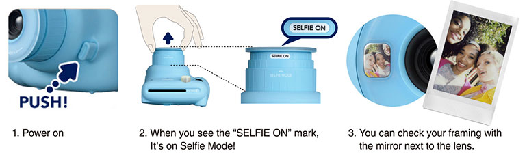 Si l’Instax Mini 11 reprend le petit miroir au niveau de l’optique utilisé déjà sur l’Instax Mini 9, un mode Selfie fait aussi son apparition. Une fonctionnalité indispensable pour la cible visée par ce type d’appareil.