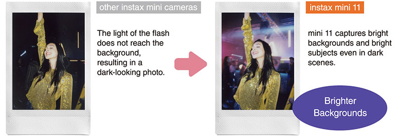 L’Instax Mini 11 peut réaliser l’exposition automatiquement en adaptant la vitesse de déclenchement à la situation. Cette exposition automatique est aussi adaptée à l’utilisation du flash, et permettra d’éviter l’obscurcissement systématique du fond tout en exposant parfaitement le sujet.