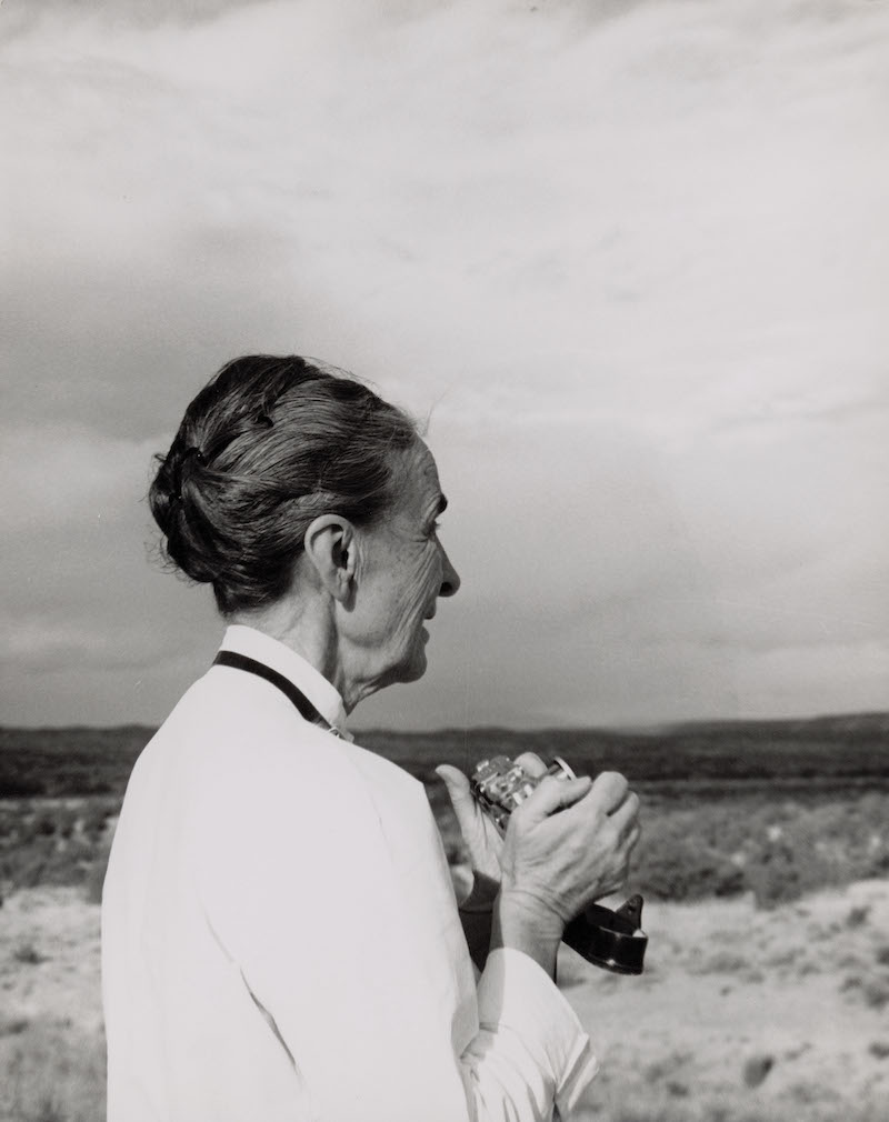 Todd Webb. Georgia O'Keeffe with Camera, 1958. Gelatin silver print, 9 7/16 x 7 5/8 inches. Georgia O'Keeffe Museum. Gift of The Georgia O'Keeffe Foundation. © Todd Webb Archive. [2006.6.982] -