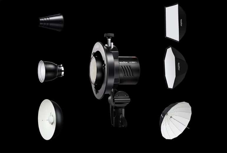 La rotule Godox S2 est elle aussi compatible avec le AD100Pro. Elle permettra d’utiliser les modificateurs de lumière en monture Bowens.