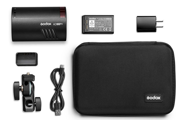 Le Godox AD100Pro (ou FlashPoint AD100Pro, identique) est livré avec une batterie, un chargeur, la rotule Godox AD-E2, un câble USB, et une sacoche de transport.