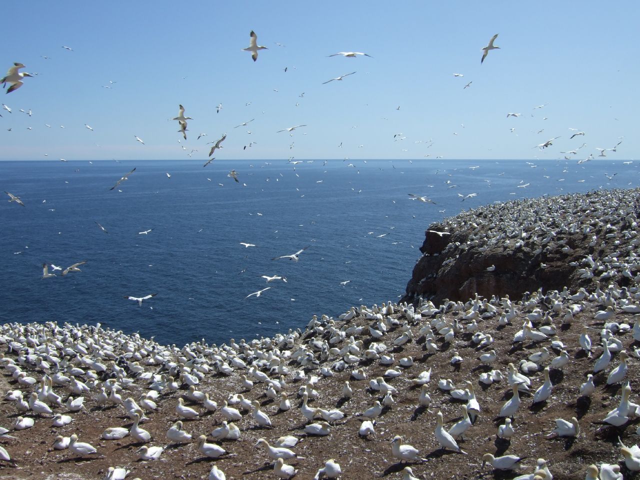 Les oiseaux sont présents sur le site environ d’avril à juillet et le spectacle est particulièrement impressionnant. C’est une des colonies les plus importantes du monde. Que ce soit au sol ou en l’air, l’espace est envahi et il est possible d’observer tous les types de comportement en fonction de l’état d’avancement de la reproduction.