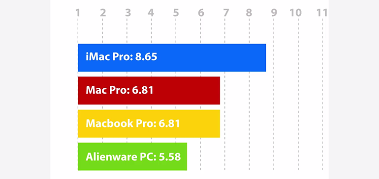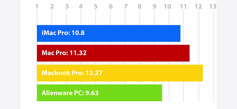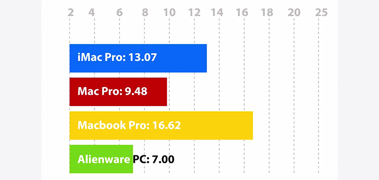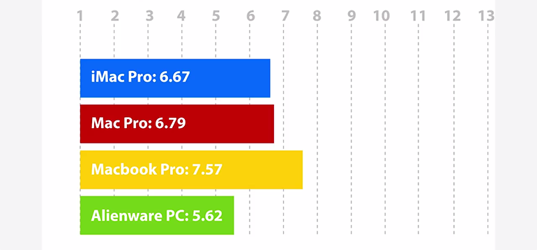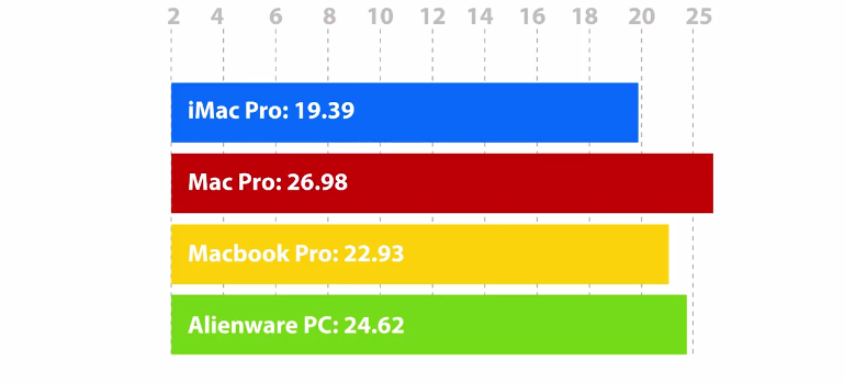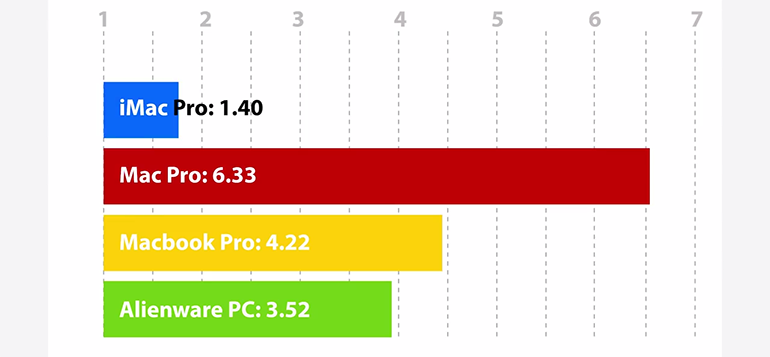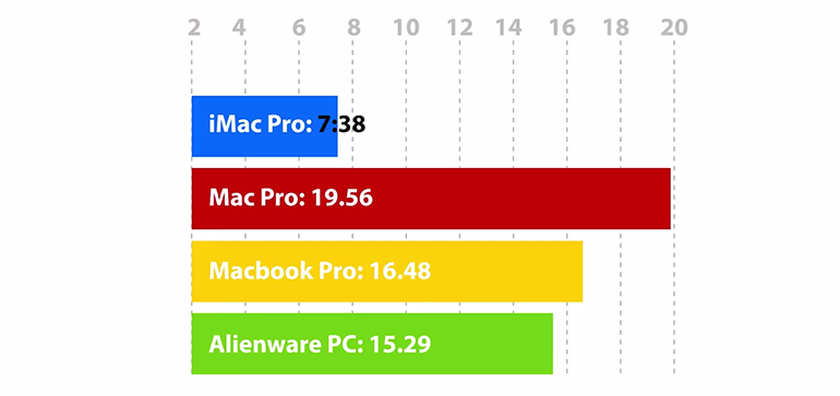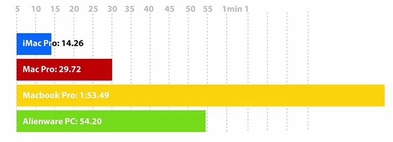 En encodage vidéo pour produire une vidéo en 1080p pour Youtube, les résultats sont sans appel : l’iMac Pro réalise l’opération en seulement 7 minutes et 38 secondes, alors que MacBook Pro et PC Alienware sont dans un mouchoir de poche à 15 minutes et 29 secondes et 16 minutes et 48 secondes. En fin de peloton, le Mac Pro met presque 20 minutes pour effectuer l’opération. Ici, l’iMac Pro montre vraiment des capacités au-dessus du lot.
