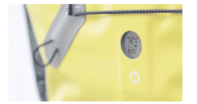 Lors d’une utilisation en situation extrême, le risque d’avoir mal fermé le sac est bien sûr une inquiétude légitime. Inrigo a pensé à tout avec un capteur d’humidité qui non seulement affiche des informations précieuses sur un petit écran intégré sur le côté du sac, mais en plus, il peut livrer ces informations sur votre smartphone via Bluetooth.