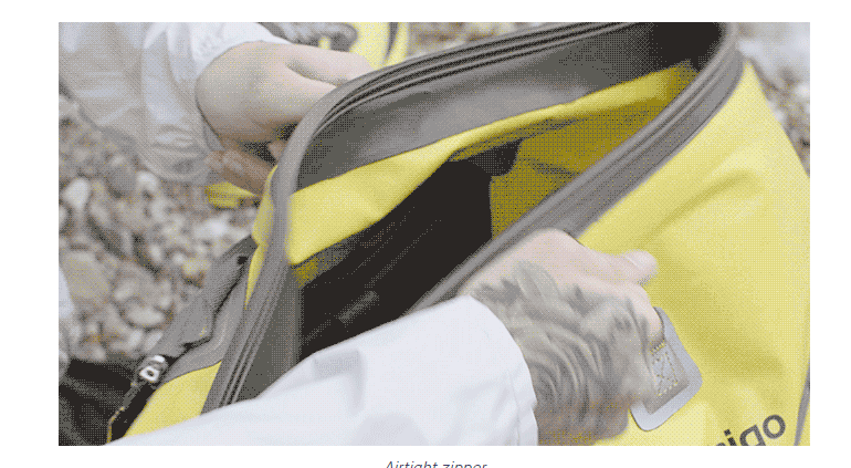 La fermeture de ce sac a été prévue pour être à la fois étanche et rapide à l’utilisation, évitant ainsi de devoir passer trop de temps à l’ouvrir. Cette fermeture fait immédiatement penser à celle des sachets de congélation par glissière, et a été optimisée pour être totalement fiable. Elle crée aussi une étanchéité totale à l’air.
